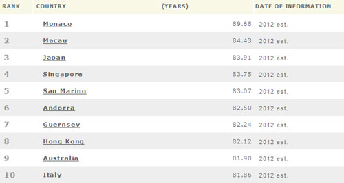 เมื่อวันที่ 2 ธันวาคม เว็บไซต์เดลิเมลของอังกฤษ ได้เปิดเผยผลการจัดอันดับประเทศที่ประชากรมีอายุเฉลี่ยสูงที่สุดในโลก (Highest Life Expectancy) ประจำปี 2555 จากซึ่งตีพิมพ์ในเดอะเวิลด์แฟกต์บุก ของสำนักข่าวกรองกลางสหรัฐฯ (ซีไอเอ) โดยผลปรากฏว่า ประเทศโมนาโก คว้าแชมป์อันดับที่ 1 ขณะที่ประเทศไทยร่วงลงมาอยู่ที่อันดับ 114 จากจำนวนทั้งหมด 222 ประเทศ
