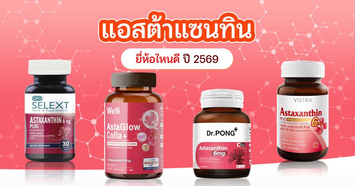 แอสต้าแซนทิน หาได้ทั้งจากอาหารทั่วไป และในรูปอาหารเสริมที่มีอยู่หลากหลายยี่ห้อ ทว่าจะเลือกกินแบบไหนดีให้ได้ประโยชน์ต่อร่างกายอย่างเต็มที่ มาดูกัน อาหารเสริมแอสต้าแซนทิน (Astaxanthin) กำลังเป็นที่นิยมมาก ๆ เพราะมีกระแสบอกต่อกันว่าดีต่อสุขภาพอย่างนั้นอย่างนี้ ทว่าจริง ๆ แล้ว แอสต้าแซนทิน คืออะไร หาได้จากไหน และมีประโยชน์ต่อร่างกายยังไง วันนี้เราจะพามาดูข้อมูลไปพร้อมกัน แถมด้วยรีวิวแอสต้าแซนทิน ในรูปอาหารเสริม เพื่อให้เช็กด้วยว่า Astaxanthin ยี่ห้อไหนดี แอสต้าแซนทิน ภาษาอังกฤษคือ Astaxanthin เป็นหนึ่งในสารกลุ่มแคโรทีนอยด์ หรือสารต้านอนุมูลอิสระที่ร่างกายสร้างขึ้นเองไม่ได้ ต้องได้รับจากอาหารและพืชที่มีสีแดง หรือสีชมพู-แดง เช่น สาหร่ายสีแดง ไข่ของสัตว์ทะเล กุ้ง ล็อบสเตอร์ ปลาแซลมอน ปลาเทราต์ และกุ้งเคย (Krill) เป็นต้น มีคำกล่าวว่า แอสต้าแซนทิน คือ ราชินีแห่งสารต้านอนุมูลอิสระ ดังนั้น ลองมาดูกันว่าประโยชน์ของสารตัวนี้ช่วยอะไรได้บ้าง เป็นสารต้านอนุมูลอิสระที่มีประสิทธิภาพสูง มีฤทธิ์ในการต้านอนุมูลอิสระมากกว่าวิตามินอี 550 เท่า มากกว่าวิตามินซีถึง 6,000 เท่า จึงมีส่วนช่วยปกป้องเซลล์จากการถูกสารอนุมูลอิสระทำลายได้อย่างมีประสิทธิภาพ มีส่วนช่วยชะลอความเสื่อมของร่างกาย ทั้งในระบบเลือด กล้ามเนื้อ จอประสาทตา ระบบสมอง และระบบประสาท มีส่วนช่วยป้องกันกระบวนการเสื่อมของเซลล์ผิวหนังก่อนวัยอันควร ชะลอการเกิดริ้วรอย ลดรอยแผลเป็น เพิ่มความชุ่มชื้นให้ผิว ดีต่อสายตา มีส่วนช่วยบรรเทาอาการตาแห้ง และอาการเมื่อยล้าของสายตา มีส่วนช่วยต้านการอักเสบของข้อต่อ เอ็น และกล้ามเนื้อ และยังมีส่วนช่วยลดการสร้างสารก่อการอักเสบได้ มีส่วนช่วยลดอาการปวดกล้ามเนื้อหลังออกกำลังกาย เพิ่มความแข็งแรงของกล้ามเนื้อ และช่วยให้ฟื้นฟูร่างกายได้เร็วขึ้น มีส่วนช่วยลดความเสี่ยงโรคต่าง ๆ เช่น โรคเบาหวาน โรคหัวใจและหลอดเลือด จากการลดอนุมูลอิสระที่ทำลายตับอ่อนหรือทำลายผนังหลอดเลือด การรับประทานแอสต้าแซนทินร่วมกับโคเอนไซม์คิวเท็น มีส่วนช่วยเพิ่มจำนวนอสุจิ ทำให้อสุจิแข็งแรง เพิ่มโอกาสการตั้งครรภ์ได้มากขึ้น เมื่อรับประทานเป็นอาหารเสริม ปริมาณแอสต้าแซนทินที่ร่างกายรับได้ค่อนข้างปลอดภัยอยู่ที่ประมาณ 4-12 มิลลิกรัมต่อวัน ทั้งนี้ ควรให้แพทย์หรือเภสัชกรเป็นคนกำหนดปริมาณให้ เพื่อให้ได้ปริมาณที่เหมาะสมกับร่างกายของเราจริง ๆ หากต้องการรับประทานในรูปแบบอาหารเสริม แอสต้าแซนทินจะเหมาะกับกลุ่มคนต่อไปนี้ ผู้ที่ต้องการดูแลสุขภาพ ชะลอความเส