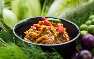 น้ำพริก เป็นเมนูอาหารที่อยู่คู่คนไทยมาช้านาน แต่หากต้องการกินน้ำพริกไม่อ้วนด้วย จะต้องเลือกเมนูน้ำพริกแบบไหนดี เมนูน้ำพริกเป็นอาหารสุดเฮลธ์ตี้แบบไทย ๆ ที่เพียงกินคู่กับผักสด ผักต้ม ไข่ต้ม แค่นี้ก็อร่อยได้ง่าย ๆ และด้วยรสชาติที่ครบเครื่อง ทำให้น้ำพริกเป็นอาหารเพื่อสุขภาพ ที่กินได้ไม่รู้จักเบื่อ แม้กระทั่งคนที่กำลังลดน้ำหนักก็กินผักกับน้ำพริกในหลาย ๆ มื้อเช่นกัน ดังนั้น เราจะพามาดูกันว่า น้ำพริกไม่อ้วน แคลอรีต่ำ ไม่ถึง 100 กิโลแคลอรี มีอะไรบ้าง สำหรับเมนูน้ำพริกด้านล่างนี้ ทางกองโภชนาการ กรมอนามัย ได้รวบรวมไว้ในหนังสือ 84 เมนูน้ำพริกผักรักษ์สุขภาพ ซึ่งเราได้คัดน้ำพริกที่ให้พลังงานไม่ถึง 100 กิโลแคลอรี ต่อปริมาณ 100 กรัม มาให้บางส่วนตามนี้ น้ำพริกทะเลถ้วยนี้มีหอยแมลงภู่สดเป็นส่วนประกอบหลัก โขลกกับกระเทียม พริกเหลืองเผา พริกขี้หนูสด กะปิเล็กน้อย ตามด้วยน้ำปลา น้ำมะนาว ปรุงรสตามชอบ แค่นี้ก็อร่อยได้ง่าย ๆ และให้พลังงานเพียง 55 กิโลแคลอรี ต่อ 100 กรัม หรือ 7 ช้อนกินข้าว เท่านั้น อีกทั้งยังจะได้โปรตีน ธาตุเหล็ก แคลเซียม ฟอสฟอรัส จากเนื้อหอย และสารต้านอนุมูลอิสระจากสีเหลือง เขียว แดง ของพริก พร้อมด้วยสรรพคุณทางยาของพริกที่ช่วยขับลม แก้ท้องอืด และยิ่งกินคู่กับผักสดก็จะได้วิตามิน ไฟเบอร์ รวมไปถึงคุณค่าทางโภชนาการเพิ่มไปอีก สำหรับคนที่อยากได้โปรตีนแน่น ๆ และรับวิตามินดีจากอาหาร มาลองน้ำพริกเห็ดฟางถ้วยนี้กัน เพราะจะมีส่วนผสมหลักคือเห็ดฟางและเนื้อปลาทู ซึ่งให้วิตามินดีด้วยกันทั้งคู่ ส่วนวิธีทำก็ไม่ยาก เพียงนำเห็ดฟาง ปลาทูนึ่ง หอมแดง กระเทียม พริกหยวก พริกขี้หนู โขลกให้เข้ากัน จากนั้นปรุงรสด้วยน้ำปลาตามชอบ ถ้วยนี้จะให้พลังงาน 74 กิโลแคลอรี ต่อ 100 กรัม หรือ 8 ช้อนกินข้าว โปรตีน 7.7 กรัม ฟอสฟอรัส 177 มิลลิกรัม เหล็ก 1.1 มิลลิกรัม และยังจะได้ไอโอดีน แมกนีเซียม กรดไขมันโอเมก้า 3 และ 6 จากปลาทูอีกด้วย เน้นกินผักให้มากกว่าข้าวก็อร่อยแซ่บประหยัดแคลไปอีกมื้อ เมนูน้ำพริกจากวัตถุดิบหาง่ายอย่างปลากระป๋องในซอสมะเขือเทศ ถ้วยนี้ให้พลังงานเบา ๆ ที่ 79 กิโลแคลอรี ต่อ 100 กรัม หรือ 7 ช้อนกินข้าว และนอกจากจะเป็นน้ำพริกไม่อ้วนแล้ว ซอสมะเขือเทศในปลากระป๋องยังให้สารไลโคปีน ซึ่งเป็นสารต้านอนุมูลอิสระที่ช่วยต้านมะเร็ง อีกทั้งยังเป็นเมนูน้ำพริกที่มีแคลเซียมสูงถึง 265 มิลลิกรัม ด้วยความที่ปลากระป๋องใช้ปลาทั้งตัว รวมไปถึงกระดูก อย่างไรก็ตาม ปลากระป๋องจัดเป็นอาหารแปรรูปที่มีโซเดียมสูง จึงควรระวังในการรับประทาน หรือพยายามปร