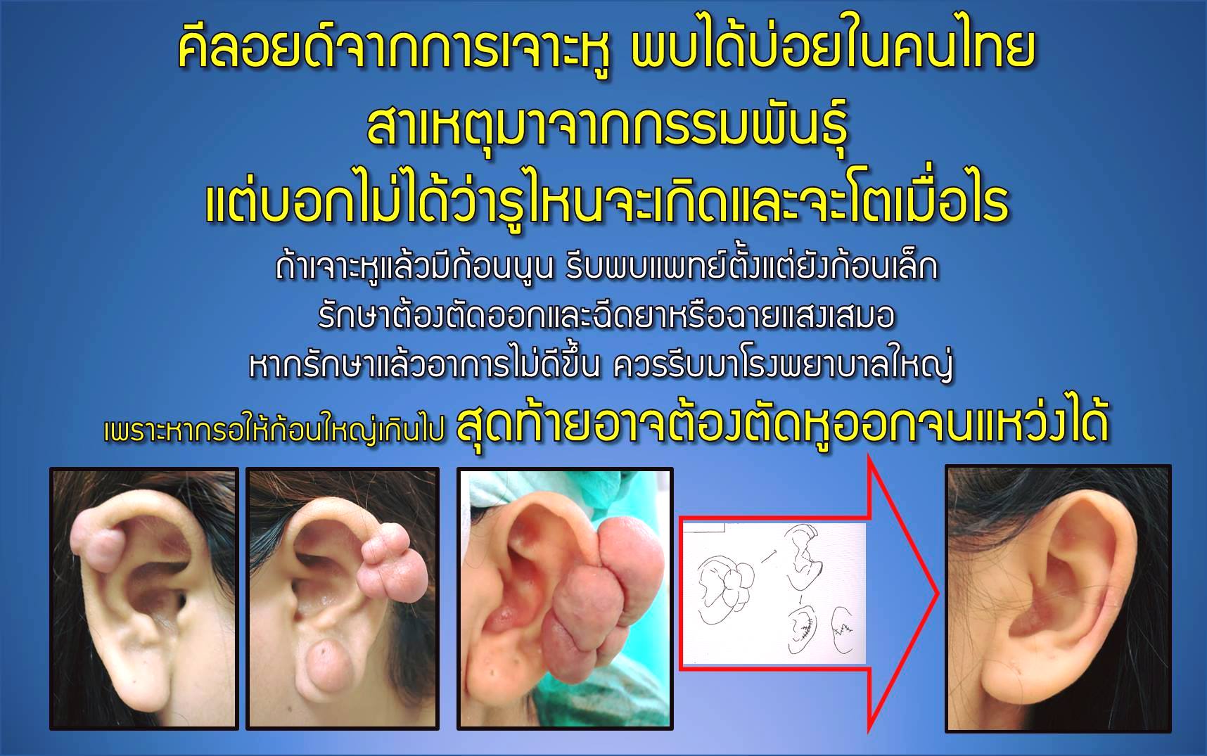 "เจาะหูแล้วเป็นคีลอยด์ มีลักษณะเป็นก้อนโตตามรูที่เจาะหูเป็นเรื่องที่พบได้บ่อยมากในคนไทย เพราะเชื้อชาติและกรรมพันธุ์