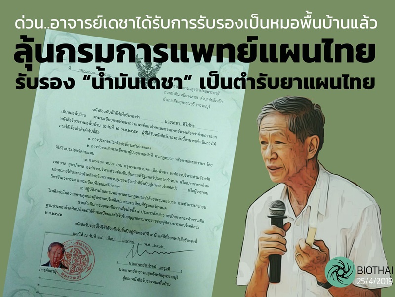 ได้ออกหนังสือรับรองการเป็นหมอพื้นบ้าน ให้กับ อาจารย์เดชา ศิริภัทร ตามระเบียบกรมพัฒนาการแพทย์แผนไทยและการแพทย์ทางเลือกว่า