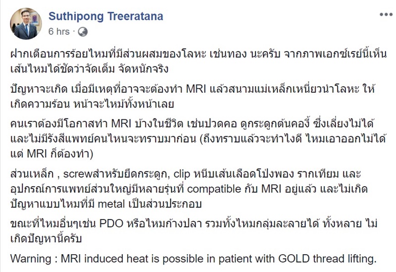 วันที่ 1 มิถุนายน 2562 เฟซบุ๊ก Suthipong Treeratana ของ นพ.สุทธิพงษ์ ตรีรัตน์ แพทย์ผู้เชี่ยวชาญด้านการศัลยกรรม ได้มีการโพสต์ข้อความเตือนคนที่คิดจะทำการร้อยไหมด้วยโลหะ เช่น ทอง ว่าอาจเสี่ยงอันตราย เพราะไหมเหล่านี้จะฝังอยู่บนใบหน้าเป็นจำนวนมาก ถ้าหากเกิดมีเหตุจำเป็นต้องเข้ารับการตรวจคลื่นแม่เหล็กไฟฟ้า หรือ เอ็มอาร์ไอ (MRI - Magnetic Resonance Imaging) จะมีความเสี่ยงอันตราย เพราะสนามแม่เหล็กเหนี่ยวนำโลหะ ให้เกิดความร้อน และจะทำให้หน้าไหม้ได้ทั้งใบหน้า