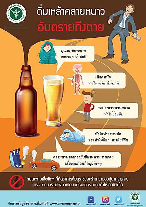 วันที่ 12 พฤศจิกายน 2562 นายแพทย์มานัส โพธาภรณ์ รองอธิบดีกรมการแพทย์ กล่าวว่า ในช่วงฤดูหนาวของทุกปี พื้นที่ในเขตภาคเหนือ ภาคตะวันออกเฉียงเหนือ จะมีอากาศหนาวเย็น ประชาชนบางกลุ่มจึงนิยมดื่มสุราเพื่อคลายความหนาว เชื่อว่าฤทธิ์ของสุราจะทำให้ร่างกายอบอุ่นขึ้น ซึ่งเป็นความเชื่อที่ผิด อันตรายถึงขั้นเสียชีวิตได้ เมื่อดื่มสุราเข้าสู่ร่างกายในระยะแรกหลอดเลือดฝอยใต้ผิวหนังจะขยายตัวทำให้รู้สึกร้อนวูบวาบ ร่างกายจะระบายความร้อนมากขึ้นโดยไม่รู้ตัวทำให้อุณหภูมิของร่างกายลดลง นำไปสู่ความเสี่ยงการเกิดภาวะไฮโปเทอร์เมีย ซึ่งทำให้เกิดความเสียหายต่ออวัยวะในร่างกาย