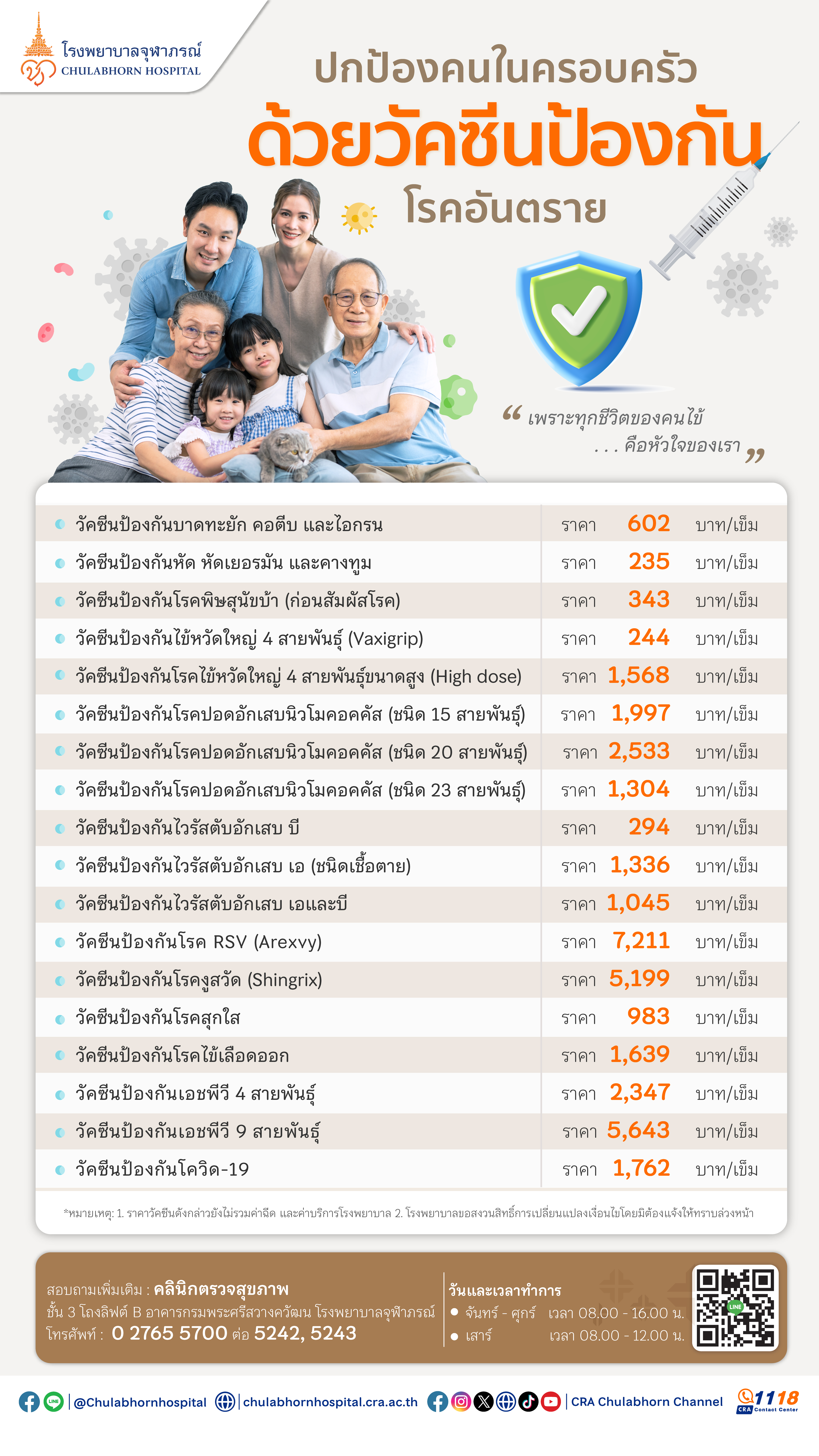 โรงพยาบาลจุฬาภรณ์ : วัคซีนชนิด 4 สายพันธุ์ ราคา 2,347 บาท/เข็ม และชนิด 9 สายพันธุ์ ราคา 5,643 บาท/เข็ม (ยังไม่รวมค่าบริการ) (ข้อมูลเพิ่มเติม)