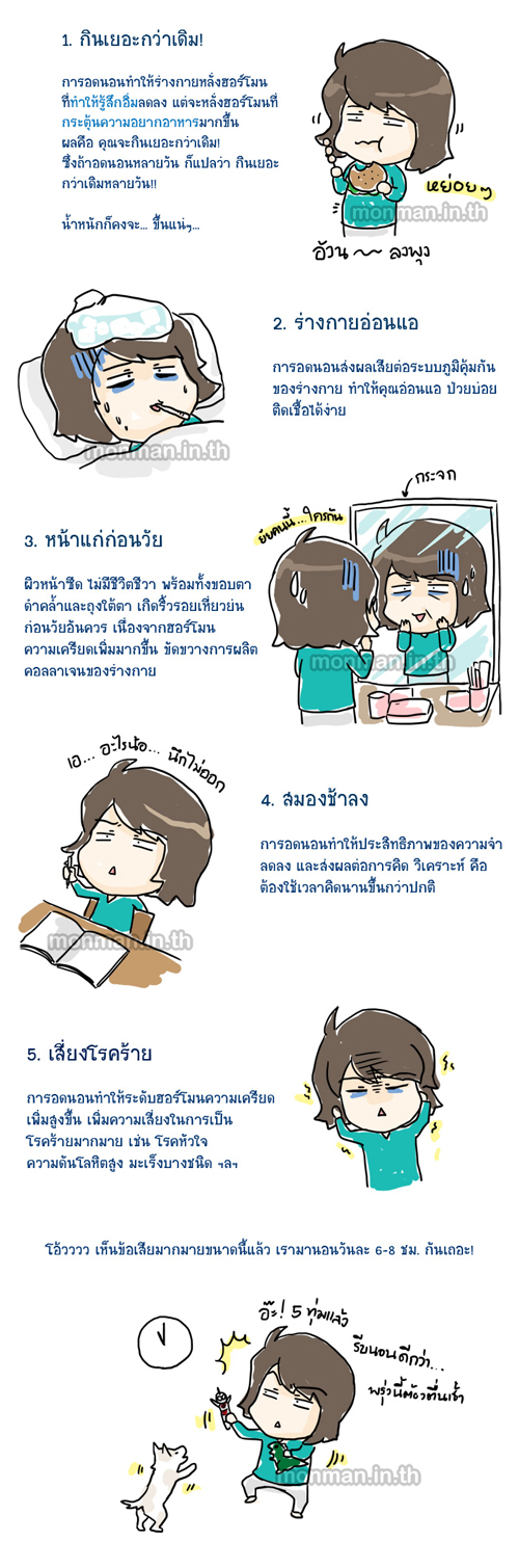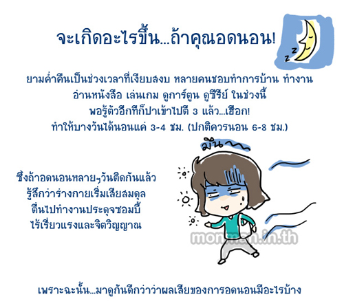 แต่เอ...ดูเหมือนว่าหลายคนยังทำหน้าสงสัยว่า "อดนอน" หรือ "นอนดึก" แล้วมันเกี่ยวอะไรกับ "หน้าแก่" และ "ความอ้วน" กันล่ะ เอ้า...ถ้าไม่เชื่อลองมาอ่านภาพการ์ตูนน่ารัก ๆ ของ คุณ monman กันดูซะ จะได้เข้าใจว่า "การอดนอน" ไม่ส่งผลดีต่อสุขภาพเลยล่ะ ว่าแต่...ใครที่ชอบ "อดนอน" มาคอนเฟิร์มซิว่า มีอาการแบบที่ คุณ monman บอกไว้หรือเปล่า...