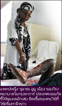 แพทย์หญิง ซูแซน อูมู เนียง ของโรงพยาบาลในกรุงดาการ์ ประเทศเซเนกัล ชี้ให้ดูแผลอักเสบ ติดเชื้อของคนไข้ที่ใช้ครีมทาผิวขาวเป็นเวลาถึง 20 ปี ที่นางดิออพ ซื่อสัตย์ต่อการบรรจงทา "ครีมผิวขาว" ลงบนใบหน้าก่อนนอนทุกคืน ด้วยความเชื่อว่า มันจะทำให้เธอดู "สวยขึ้น" กระทั่งเมื่อ 2 ปีที่แล้ว เมื่อเธอสังเกตเห็น "จุดดำๆ" หลายจุดเริ่มปรากฏขึ้นบนผิวหน้า!!!